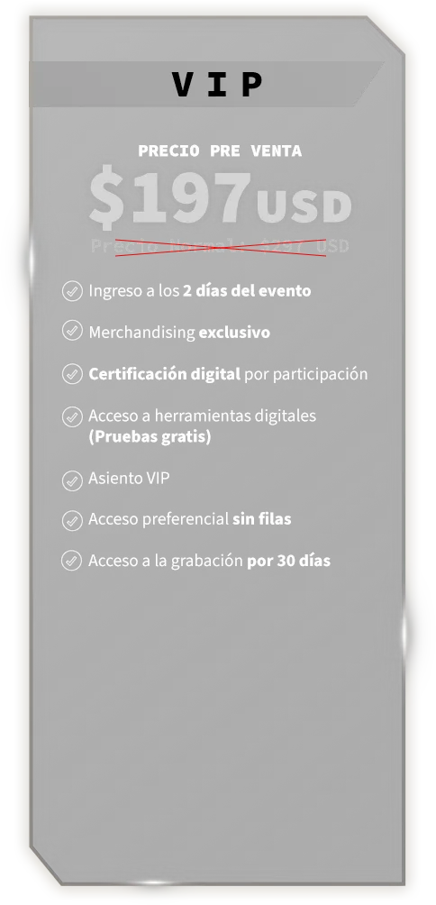 Acceso a los 2 días completos del evento, conferencias, ejercicios, networking, materiales digitales y experiencias diseñadas para que avances.